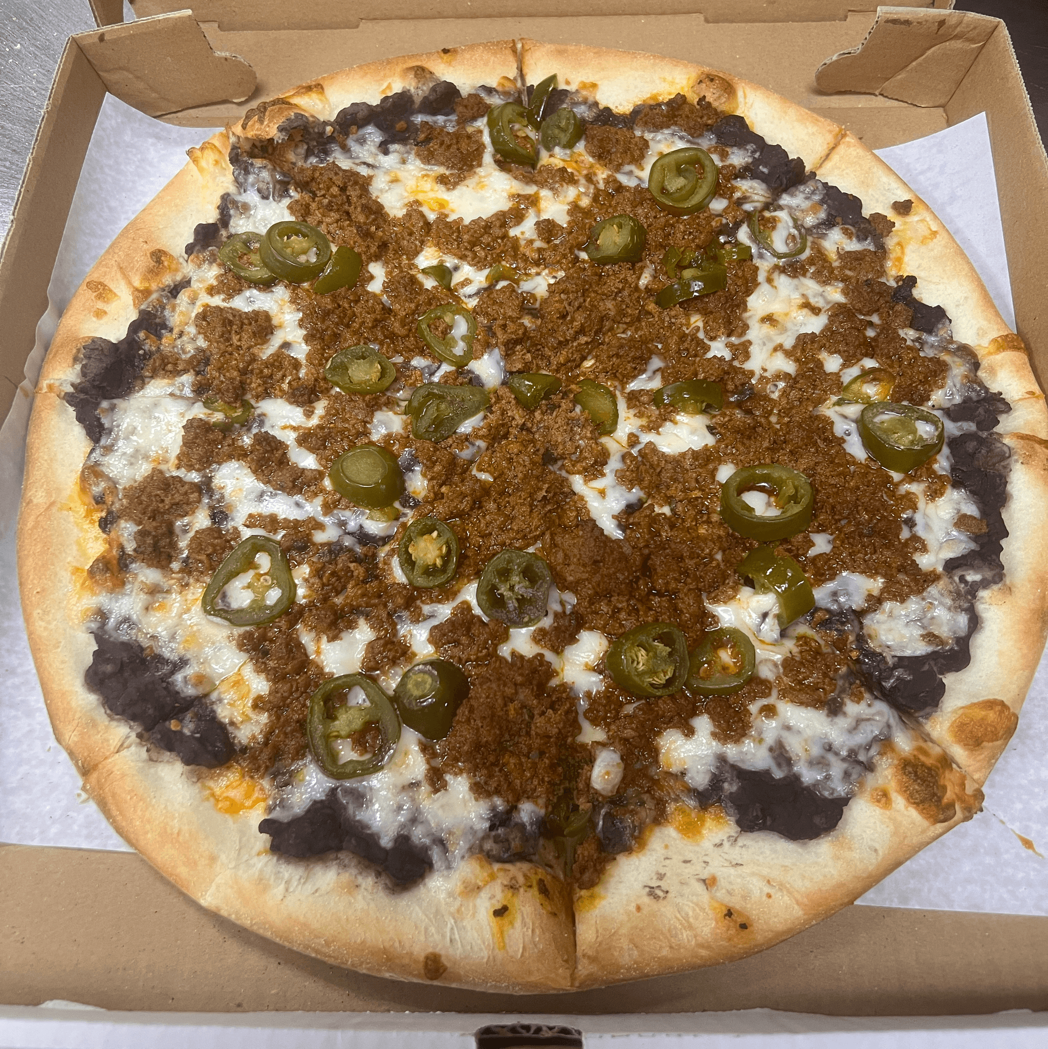 Sausage, pepperoni, green peppers, onions & mushrooms