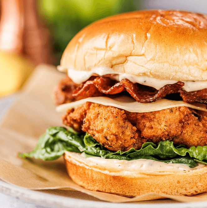 Breaded chicken, jack cheese, bacon, lettuce, tomato & ranch dressing served on a kaiser roll w/fries