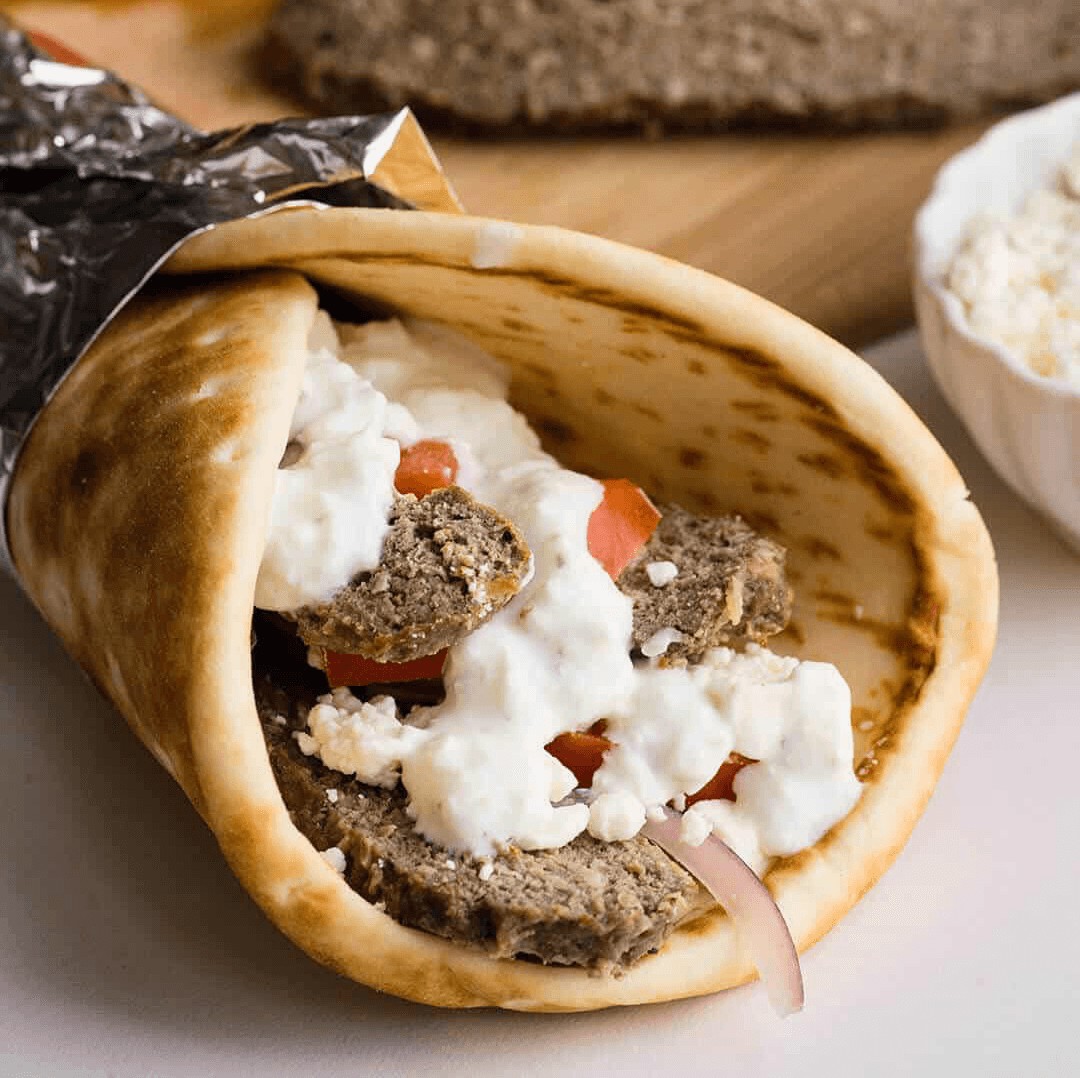 Sliced lamb on pita bread w/onion, lettuce, tomato, & tzatziki sauce