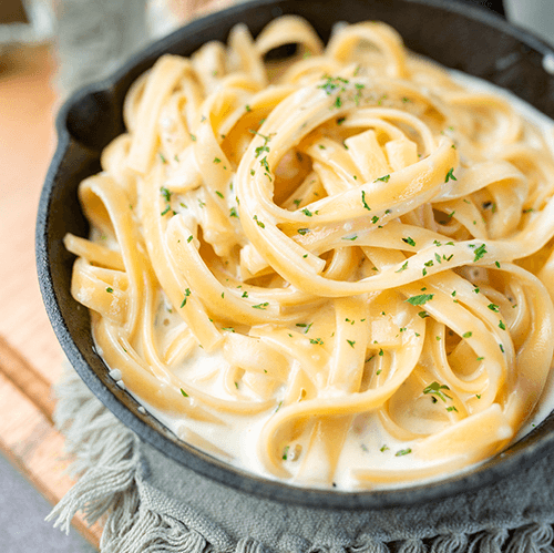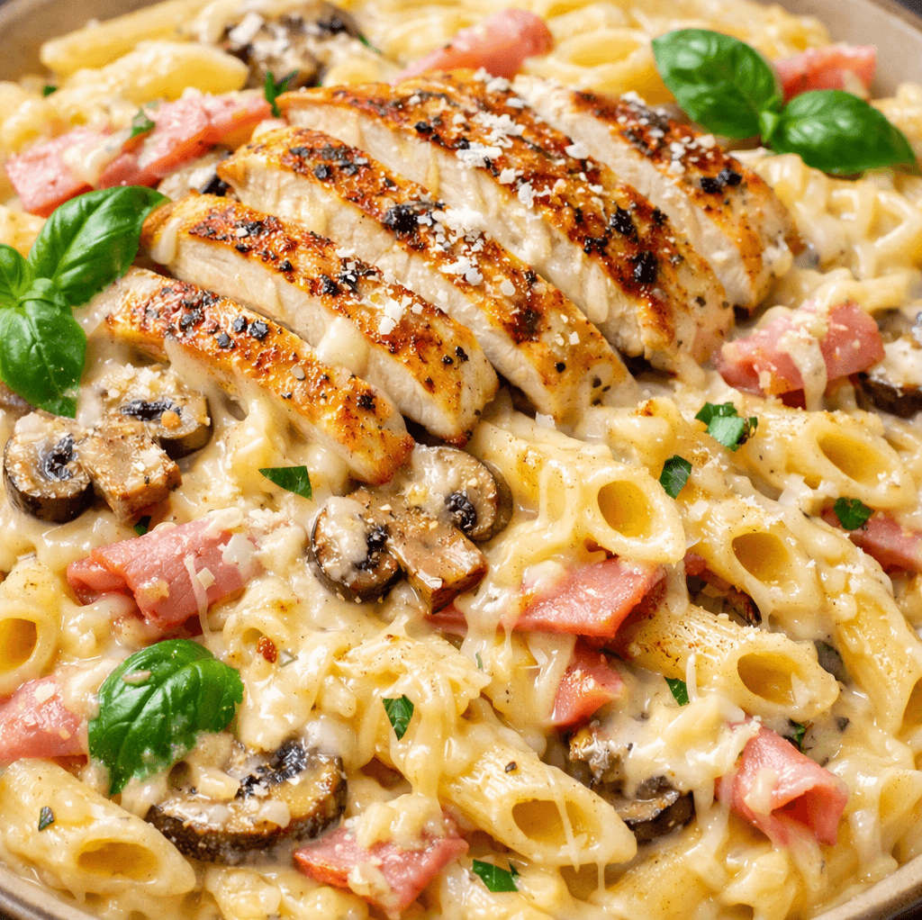 Penne pasta in alfredo sauce w/sliced ham, grilled chicken, mushrooms, basil, gouda cheese, provolone & grated parmesan cheese