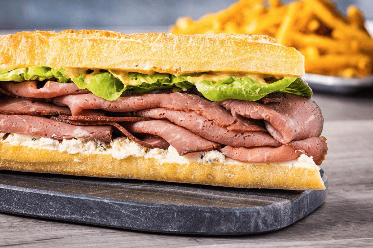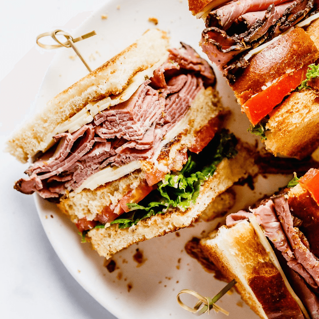 Sandwich with thinly sliced beef that has been cooked over a dry heat