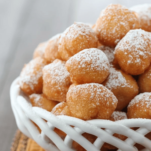 10 pieces. Fried dough topped w/powdered sugar w/ a side of Hershey chocolate dipping sauce