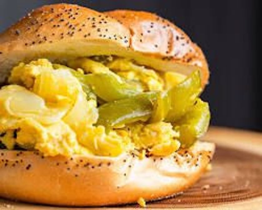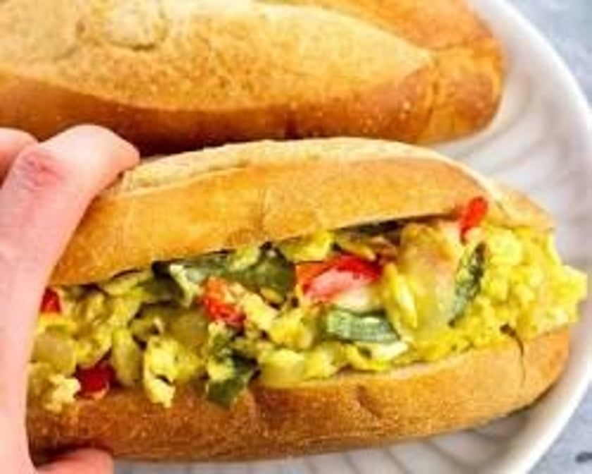 Scrambled eggs paired with sautéed peppers & served between slices of bread